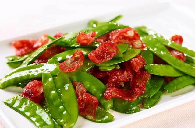 香肠先放入锅里隔水蒸20分钟。然后拿出来切成片。用大蒜爆香,放入香肠炒,炒到肥肉有点透明,有点出油了,再放入荷兰豆翻炒。最后加适量酱油、盐、鸡精调味,出锅!