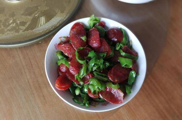 蒸好的香肠切成片,蒜片爆锅,放入香肠翻炒出油。再放入切好的尖椒段。加酱油、盐、鸡精调味即可。