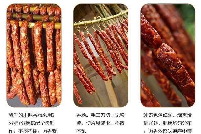 优质的香肠,采用三分肥七分瘦的猪肉,不闷不硬,肉香紧实。手工刀切,无粉渣,切片不散不乱,外表色泽红润,烟熏恰到好处,肥瘦均匀分布,肉香浓郁,味道麻中带辣。