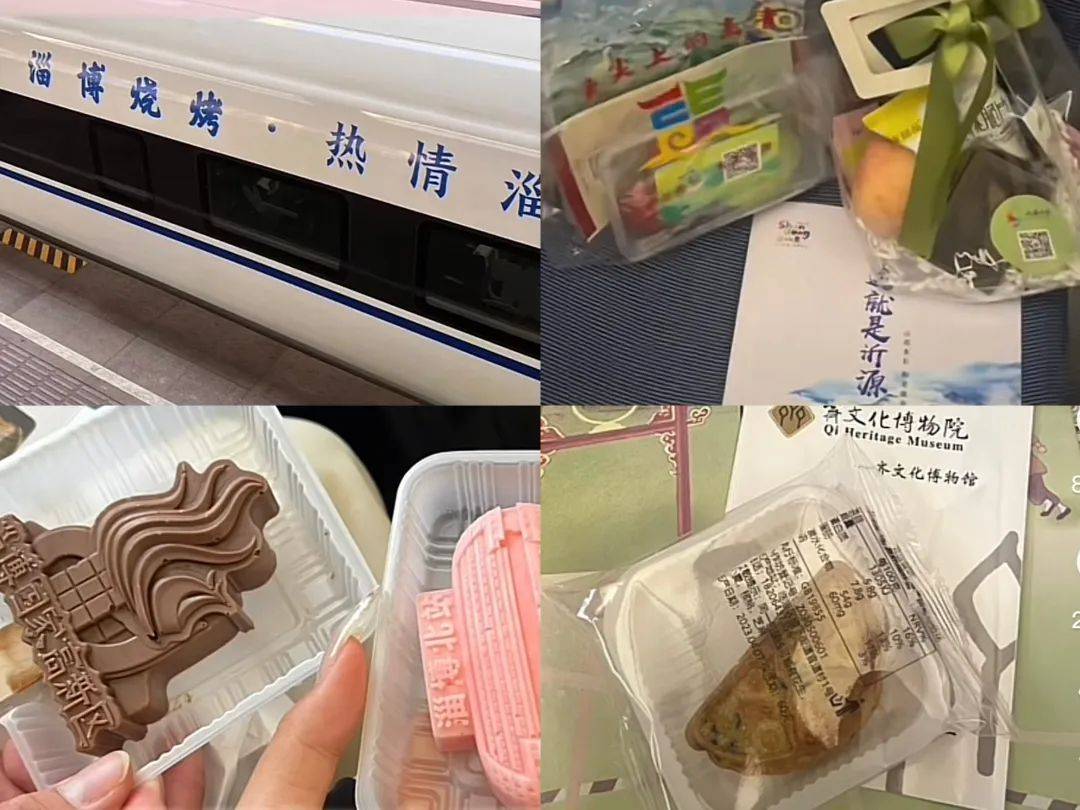 上文中我们提到过,在淄博烧烤爆火后,淄博文旅第一时间加开了24列从济南至淄博间的周末往返“烧烤专列”,还贴心为乘客准备“伴手礼”。
