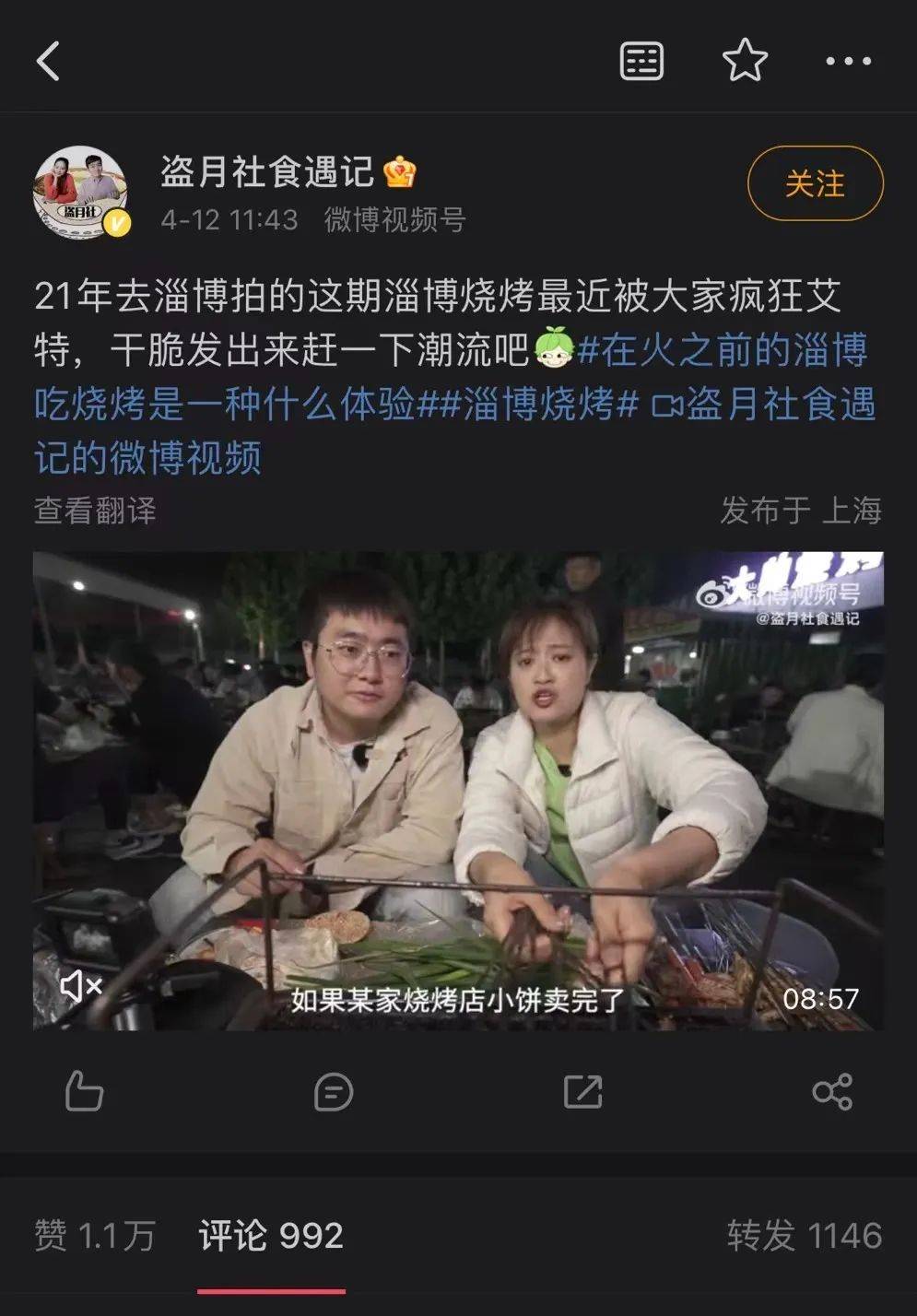 彼时,淄博烧烤已经“小有名气”,至少吸引到了不少网红博主的实地打卡。比如,全网粉丝量超千万的美食博主盗月社食遇记、特别乌啦啦等,其拍摄有关于淄博烧烤的视频播放量均位列同系列TOP。