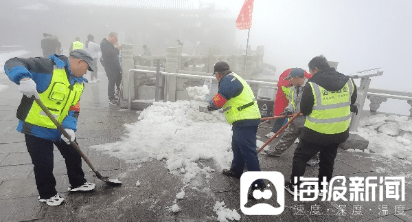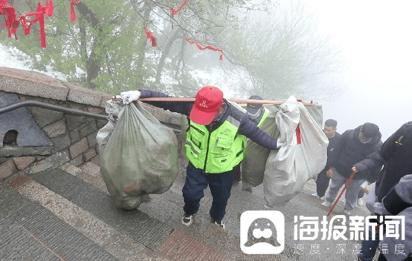 4月25日上午,海报新闻记者到达泰山天街时,几名环卫工正忙着清理前一天的积雪,还有几人挑着扁担将大袋垃圾运到集中清运点。游客们穿着羽绒服、皮衣,个个冷得缩着脖子,环卫工人们却干得满头是汗,手上脏了就抓把雪搓一搓。