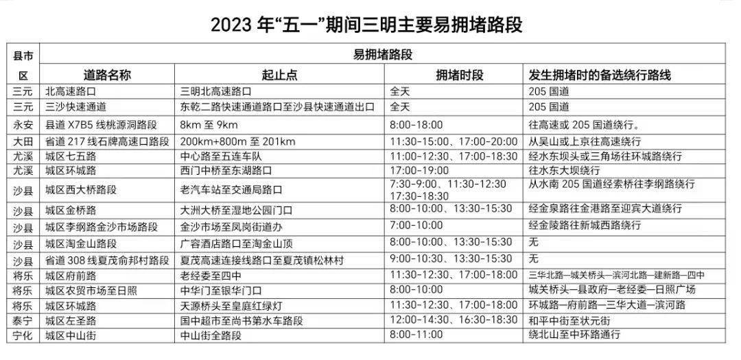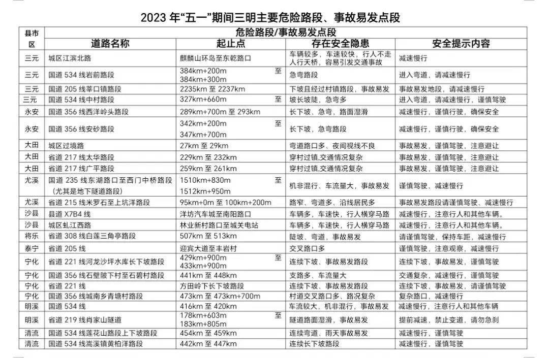 “五一”期间,我市建宁金铙山、尤溪侠天下、泰宁上青溪等景区道路弯多坡陡、临水临崖、通行条件较差,行经弯道、窄路、窄桥、隧道、临水临崖路段,请注意观察,谨慎驾驶,各行其道,减速慢行。