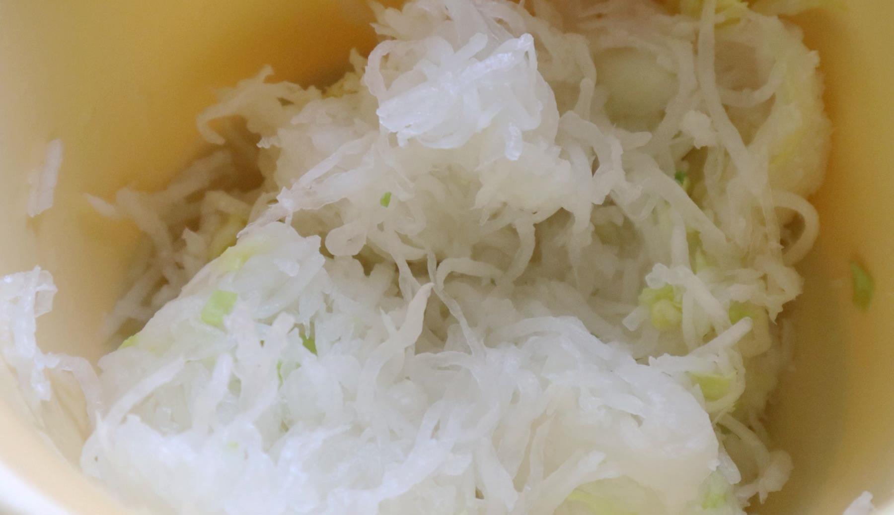 而白萝卜因为有生味,所以还是要进行处理的,将萝卜去皮然后借助擦丝器擦成细丝,然后加2勺的盐巴,腌制出水后攥干。