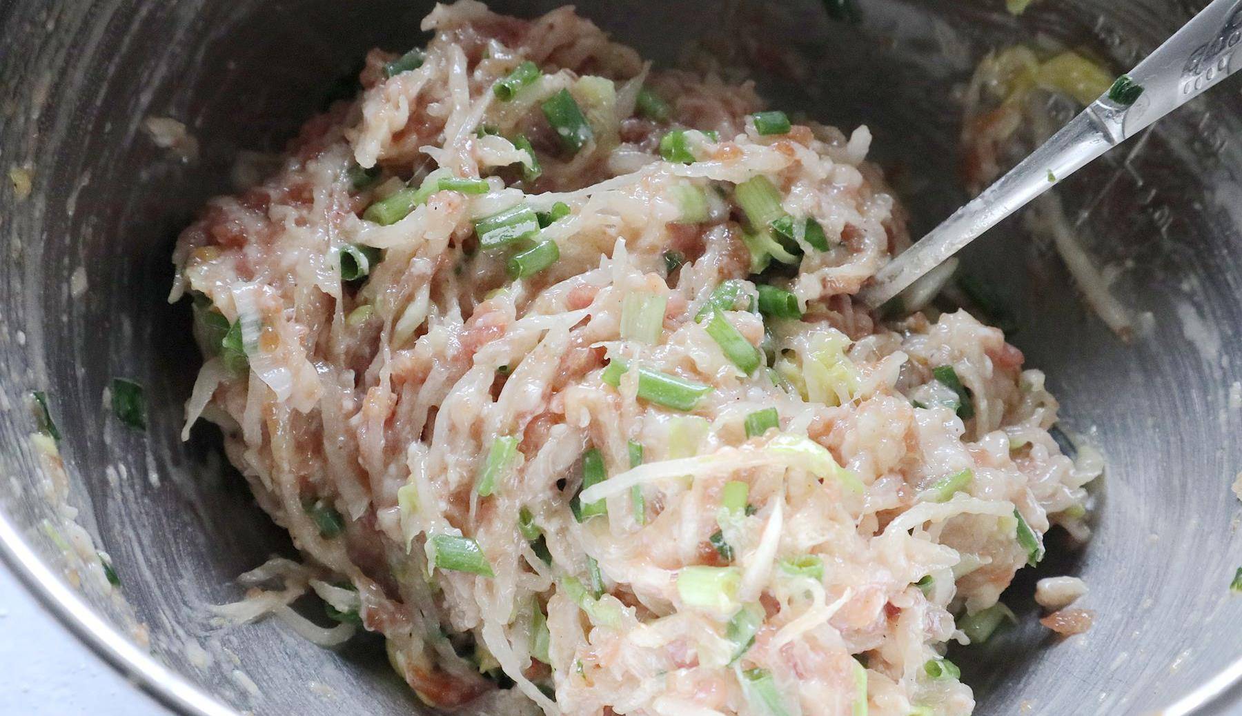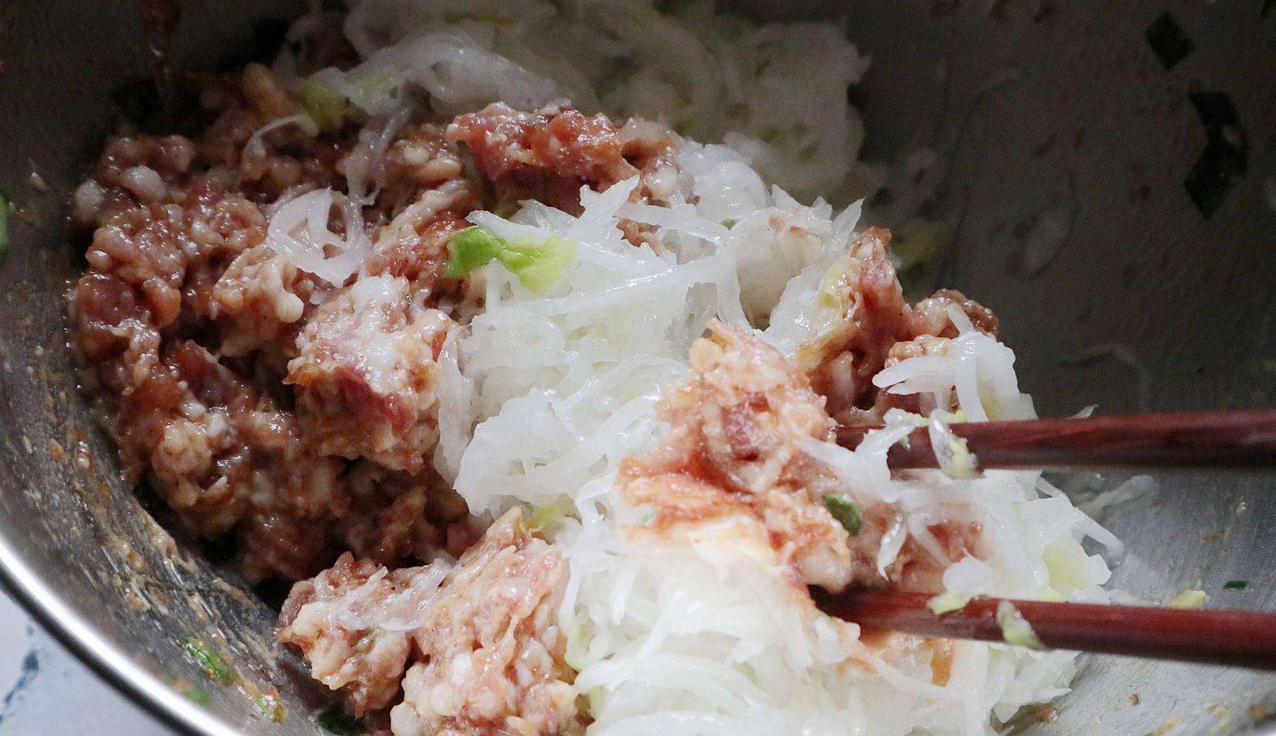 提前将肉馅用盐巴、生抽、胡椒粉和料酒,以及少许的水搅拌好,然后将白萝卜和葱末一起放入,接着再次加入胡椒粉、香油少许顺一个方向不断搅拌,让这2种食材都能很好的混合抱团在一起。