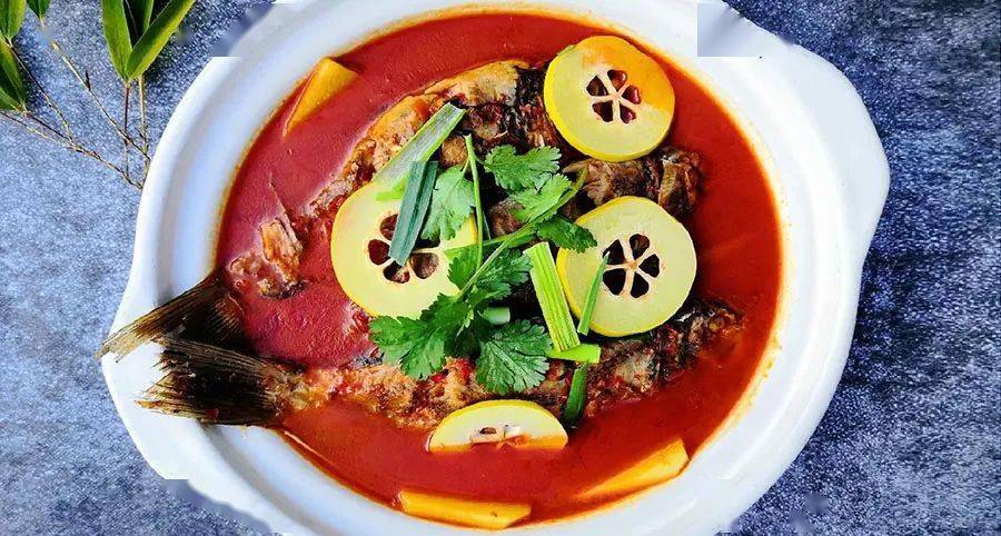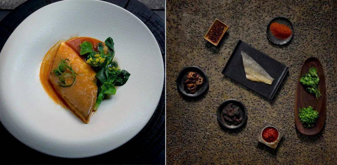 侯杰鑫师傅制作的滇·大理酸木瓜煨罗非鱼,灵感也是来大理白族传统菜肴酸木瓜煮鱼,新思路是去掉其中引发燥热的花椒、胡椒和姜,改用青柠水去腥,熬制底汤的酸木瓜需除去果皮和籽,避免整锅底汤涩口,使鱼的肉质变老。春季到来,酸木瓜煨鱼口感鲜嫩,酸辣爽口,可以起到解乏开胃,去除体内燥热火气的功效。
