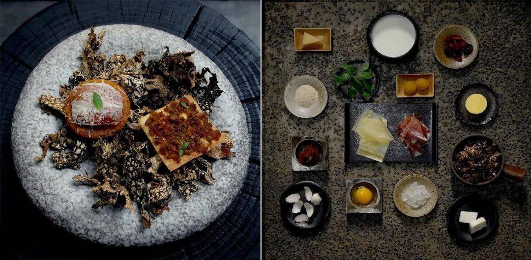 菜单中的餐前小吃是诺邓火腿&洱源乳扇,其中洱源乳扇的组合是将乳扇煎黄,制成薄脆,铺上用酸木瓜制作的巍山蜜饯,酸味糅合清香的甜味,由此开启一餐的序幕。