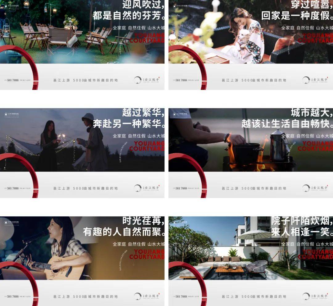 视觉符号在推广的运用上,结合项目实景美图和生活场景的营造,赋予更多的视觉变化,又形成统一的调性。