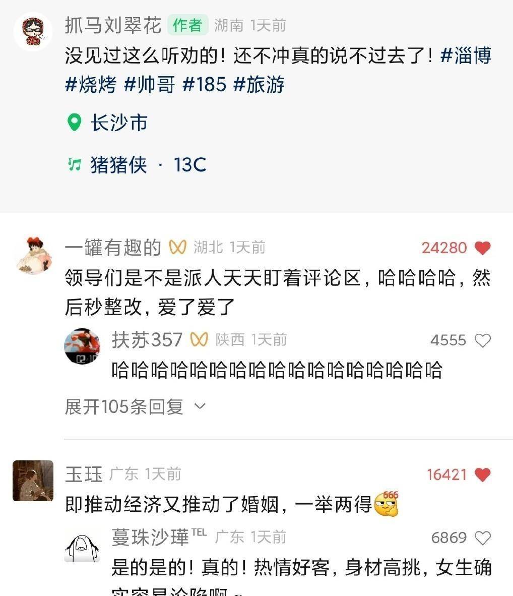 有网友呼叫淄博民政局局长,表示既然来看我们山东帅哥的姐妹这么多,应果断组织相亲大会,一条龙服务,各部门跟上。