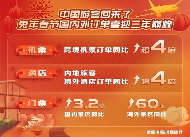 以今年春节档旅游消费为例,据携程发布的《2023年春节旅游总结报告》显示,今年春节假期,国内外旅行订单迎来三年巅峰,订单量同比增长4倍,其中出境游订单同比增长640%,跨境机票订单同比增长4倍以上。往年受欢迎的本地游和周边游也在今年变得冷清,跨省酒店预订占比近7成。