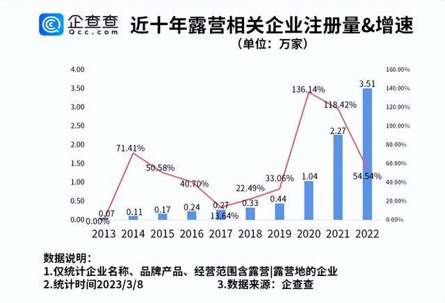 露营热度高涨,相关企业数量也在三年内迅速扩张,相关数据显示,2020年新增露营相关企业1.04万家,新增量同比增长136.14%;2021年新增2.27万家,新增量同比增长118.42%;2022年新增3.51万家,新增量同比增长54.54%。