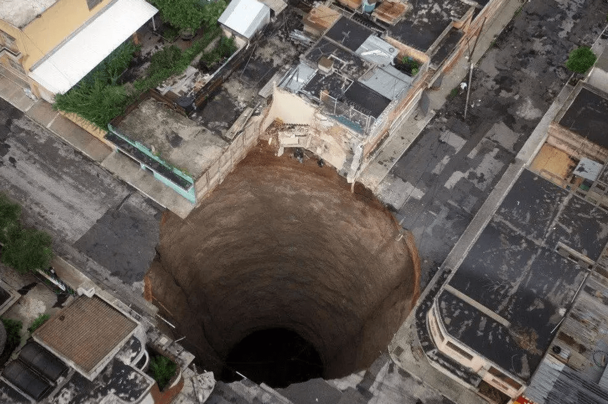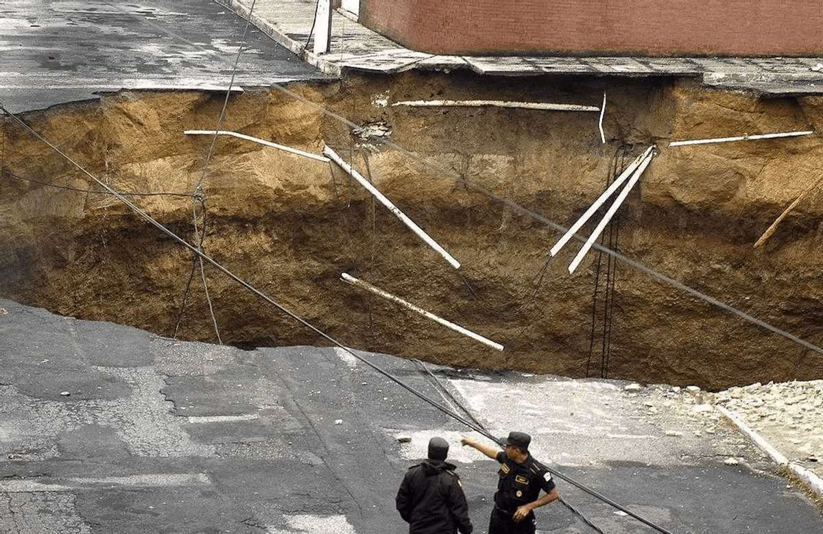 危地马拉深坑两次现身前,当地都因为飓风遭遇强降雨,快速渗透的雨水导致了火山石的崩塌,进而造成地面坍塌。可想而知,地面坍塌后,地面上的一切东西必然会被瞬间吞噬。