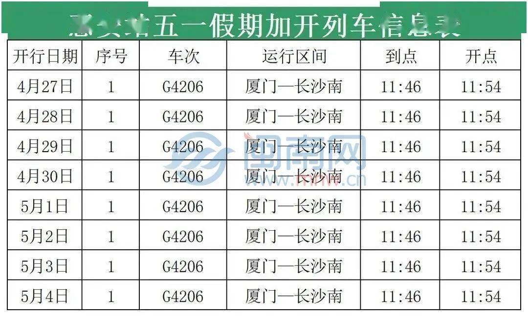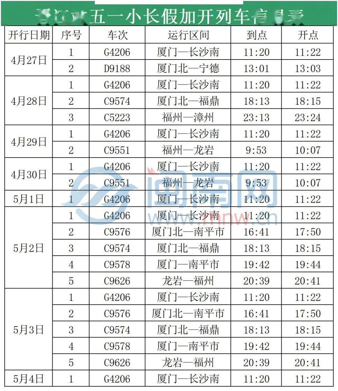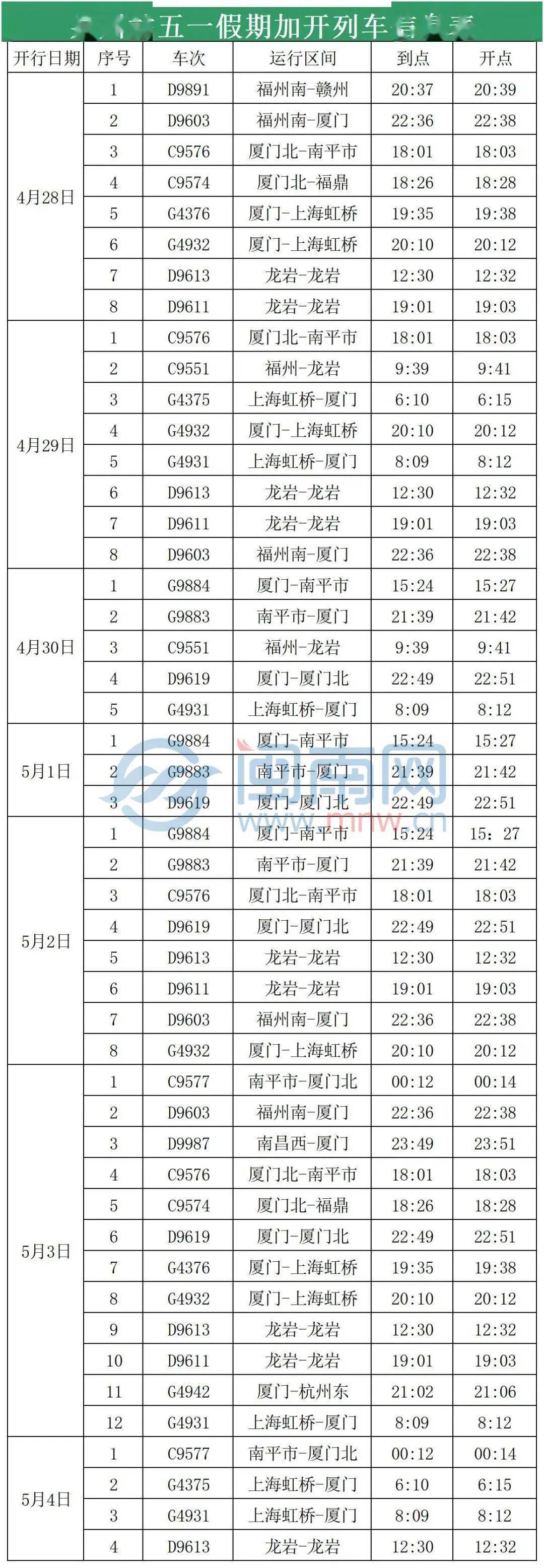 今年“五一”假期,铁路的运输期限为4月27日至5月4日,为期8天。闽南网记者从漳州车务段获悉,为方便旅客出行,铁路部门将加开多趟列车,其中多趟经停泉州站、晋江站、惠安站。