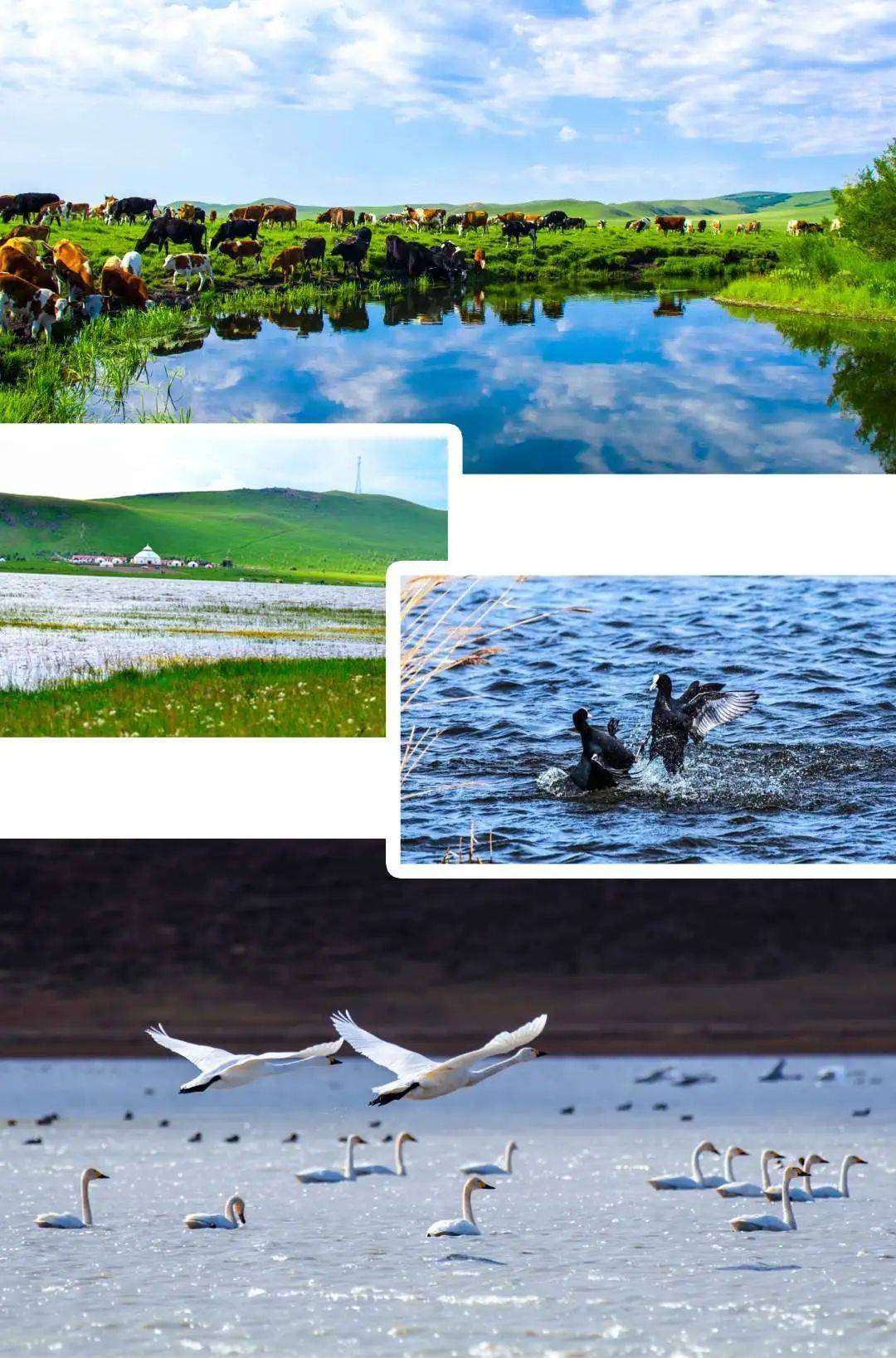 一层薄雾笼罩着湖面,水光潋滟、芦苇摇曳,一行白鹭忽闪着翅膀,悠然地飞向蔚蓝的天际。绕着湿地边弯弯的小径,探寻着绚丽多姿的野山花。百灵声声脆,婉转歌唱;泉水咚咚响,脉脉流淌。这里没有现代文明的钢筋水泥,没有繁华都市的纷乱喧嚣,只有大自然的交响乐。