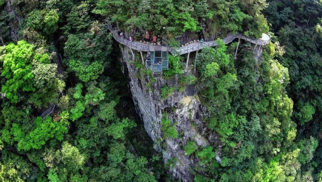 穿越时光隧道,进入了猴子的世界,沿山深入,藤树相绕,玻璃观景台上,千山一碧,处处皆景。