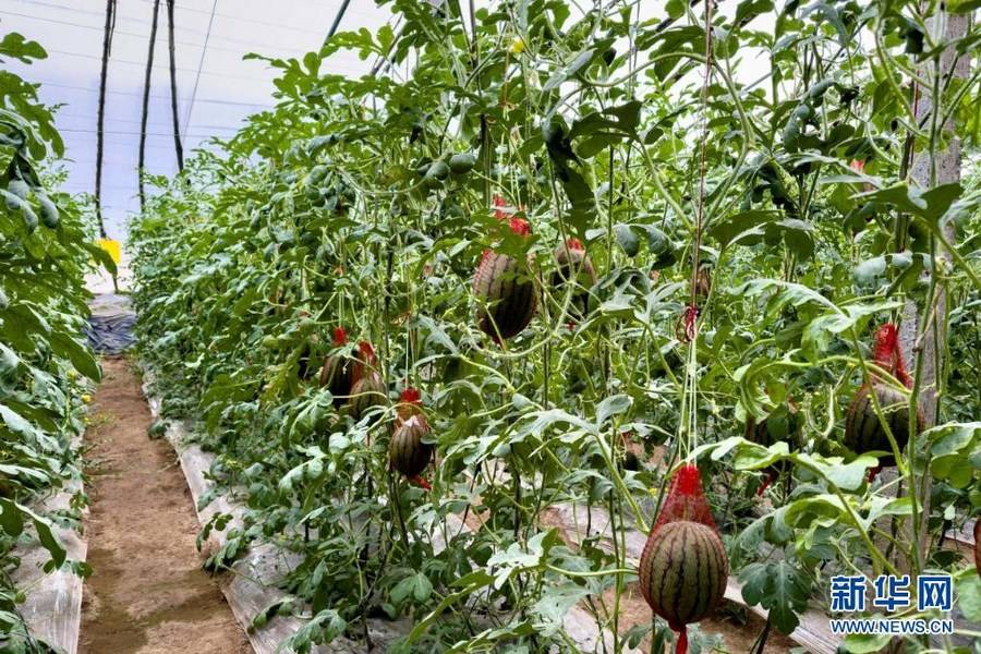 严村的蔬菜大棚内,西瓜挂在架子上。新华网 发(马梦迪 摄)