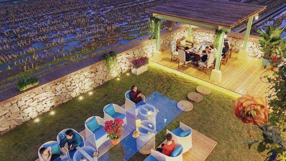 早春,晚风,星光洒下,露台就成了舞台,三五好友,喝着特调的莫吉托,轻扫吉他琴弦唱起那句“曾梦想仗剑走天涯,看一看世界的繁华”,任思绪随着旋律飞向远方。这一刻,不是为人父母,不是工作狂人,今晚只有摇曳的荔枝林、微醺的夜色、欢乐的音符和眼前这稻田一片。