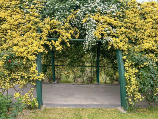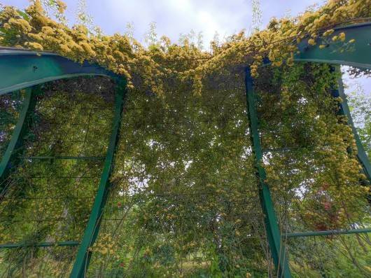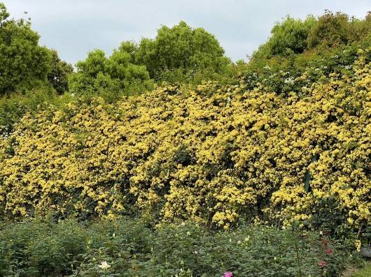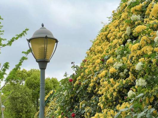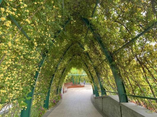 金黄的木香花层层叠叠地生长在花架上,其中又点缀着不同花色的木香,形成纷繁茂密的花朵瀑布。