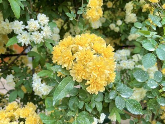 木香花拥有修长的枝干、艳丽的花色,由众多的小花簇成一团,再由绵绵的花团连成一串。
