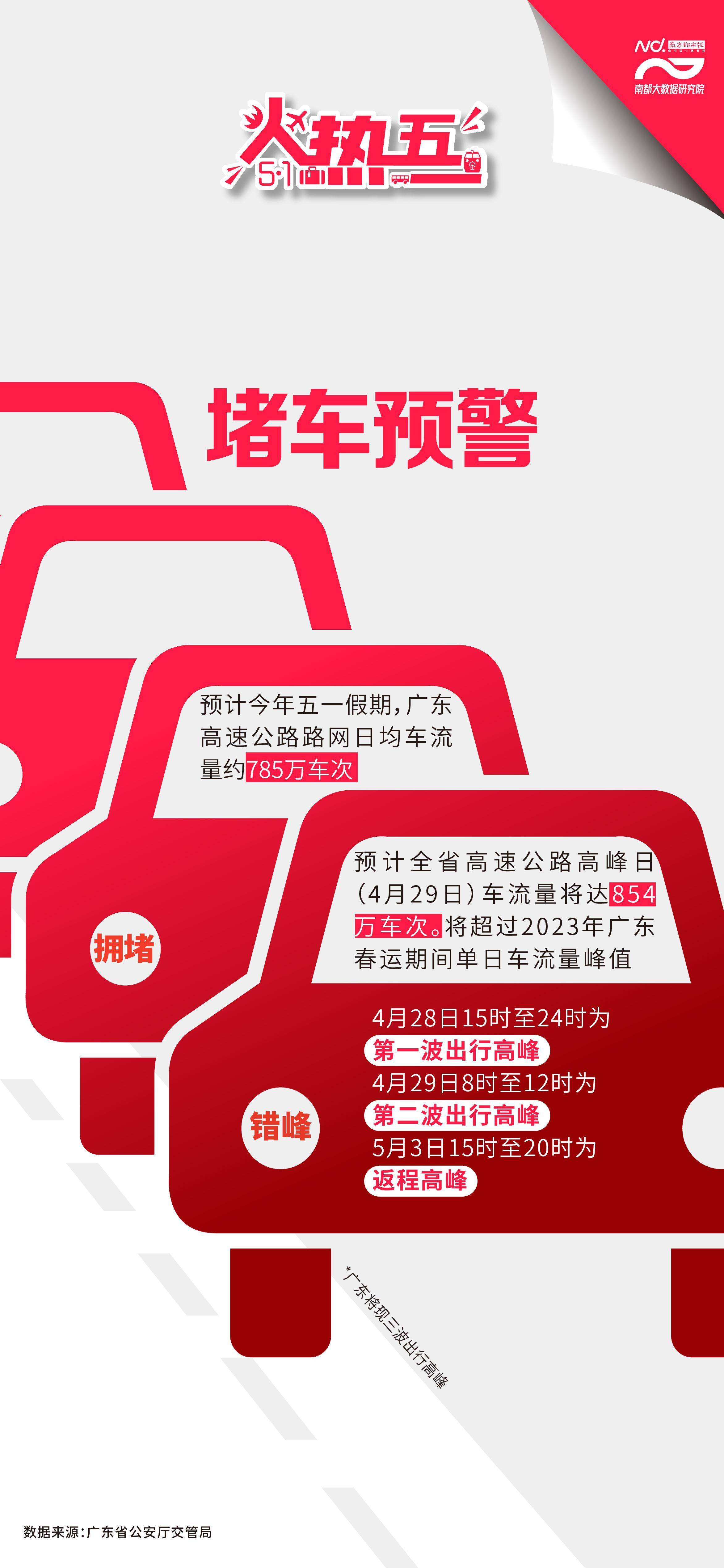 广东省交通运输厅近日发布了“避堵”攻略。广东交警预测,4月28日下午、29日上午和5月3日下午,全省将出现3个波次的出行高峰。预计4月28日15时至24时全省将迎来第一波出行高峰,车辆集中由珠三角地区往粤东西北及外省地区扩散,广深、广佛、莞深、莞佛城市之间车流量激增。4月29日8时至12时出现第二波高峰,高峰流量较前一日减少,但仍保持高位运行。5月2日部分返程车流开始出现,5月3日15时至20时将出现返程高峰,返程整体交通压力高于出程,峰值缓行点段将是出程的1.6倍。建议广大司机朋友尽量避开高峰时段出行,合理规划出行路线。