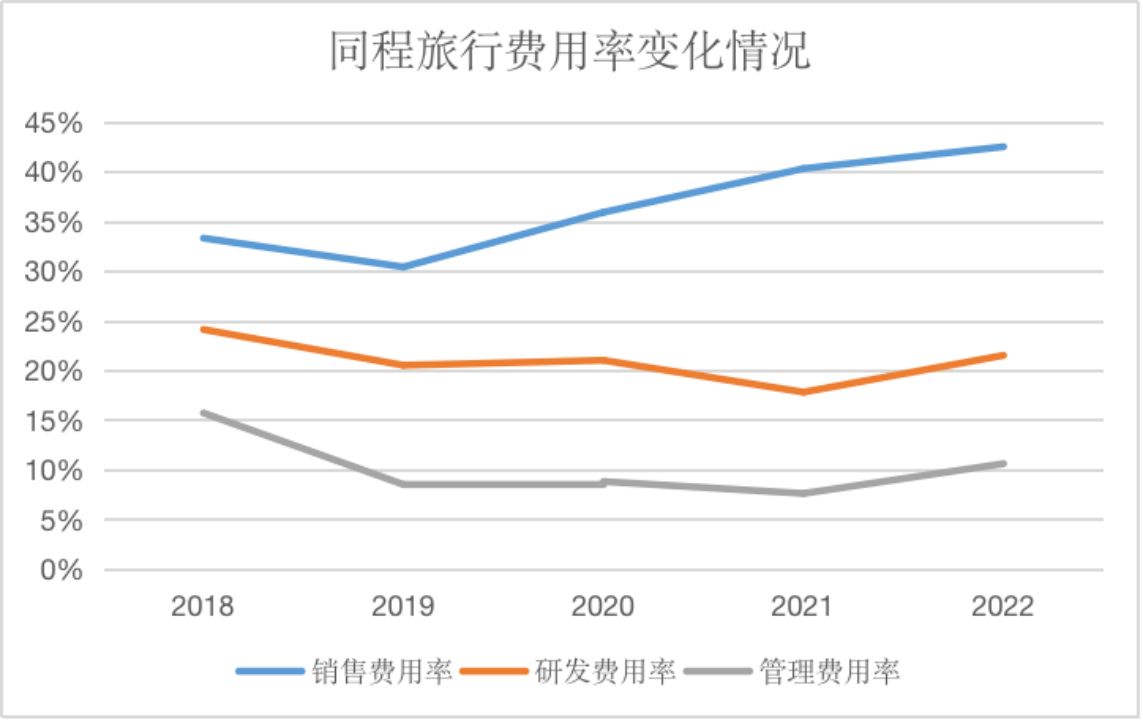 费用层面,财报显示2022年同程期间费用率达74.7%,其中销售费用率为42.5%,占比最大,主要是企业在2022年营销投放力度有所增加。