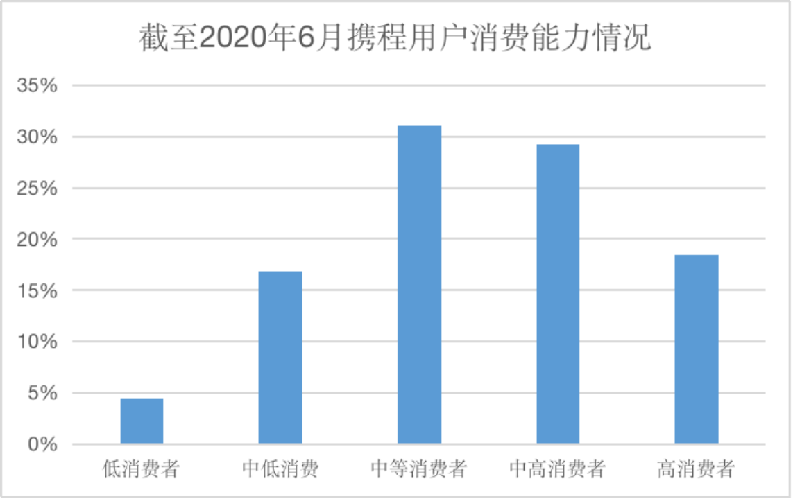 用户层面看,携程的用户主要定位在中高消费群体,根据易观千帆网截至2020年6月份的统计数据,携程用户中高消费者与中高消费者分别占比18.44%、29.16%。