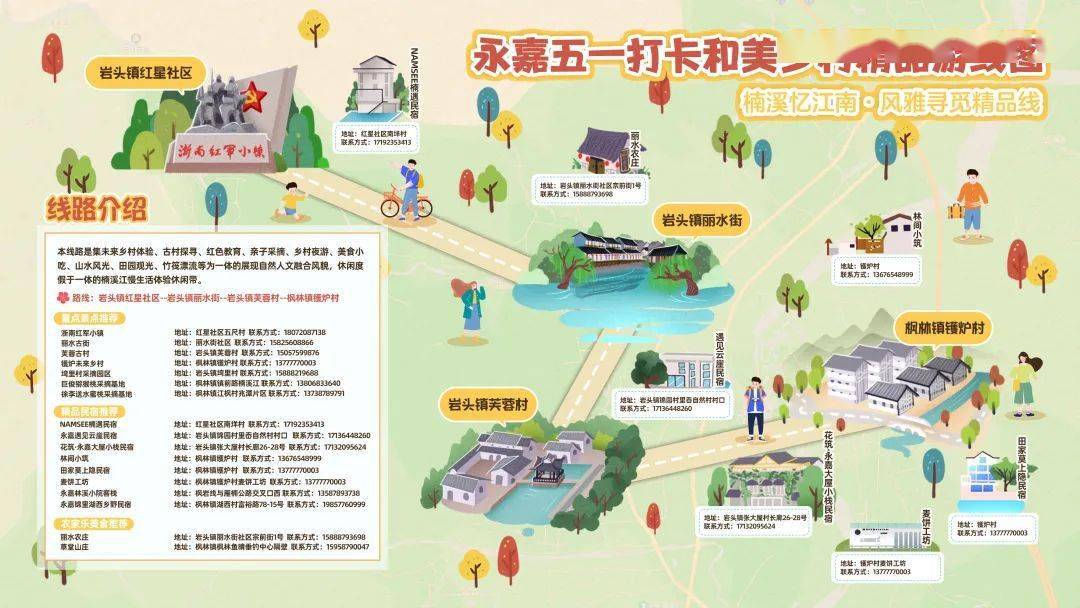 岩头红星社区——岩头NAMSEE楠遇民宿——岩头丽水古街——岩头丽水农庄——岩头芙蓉古村——岩头花筑·永嘉大屋小栈民宿——遇见云崖民宿——枫林镬炉村——枫林田家莫上隐民宿——枫林麦饼工坊——枫林林间小筑