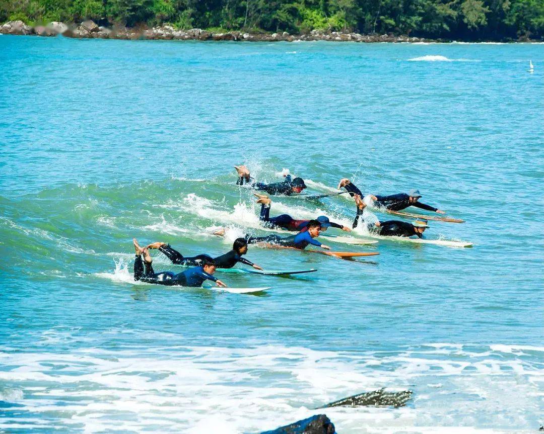 13:30 扎营结束,领取救生衣和冲浪板然后就可以去 【海上冲浪】或者去 【浆板】(分批游玩冲浪板以及浆板,2-3人一块板,报名冲浪体验课的学员,是一个人一块板跟着教练冲浪);领队组织沙滩排球以及飞盘活动。