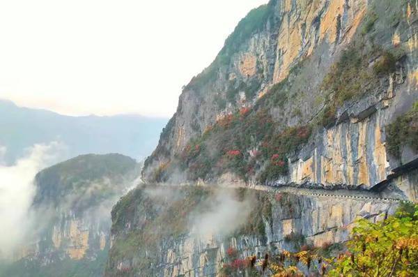 上午出发雪宝山,一睹盘旋于高山上的一条特殊乡村公路。上方岩石绝壁,外侧万丈深渊,云雾缭绕,险象环生,被称为“悬崖天路”。这条路,镶嵌在绝壁之中,似乎直通云霄。