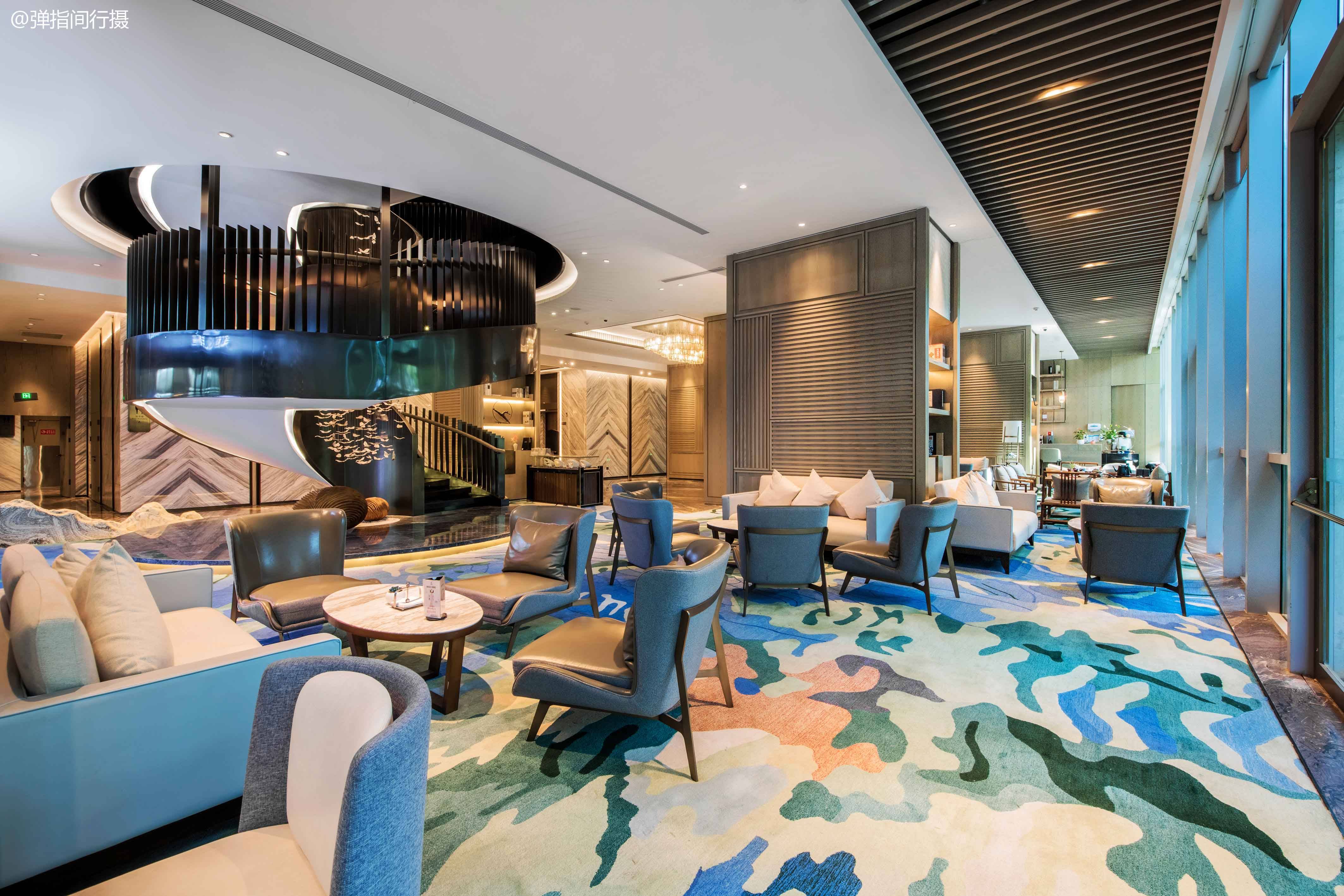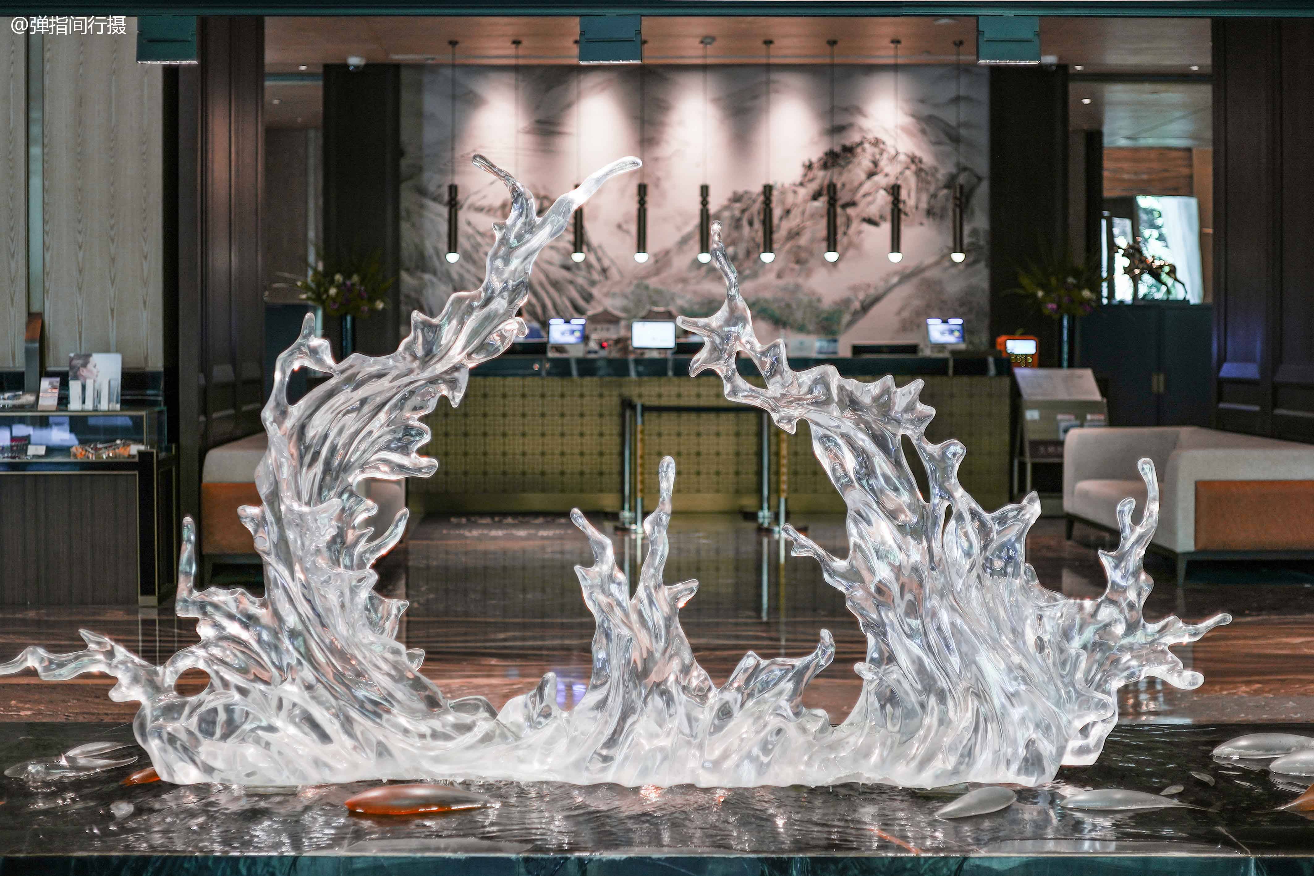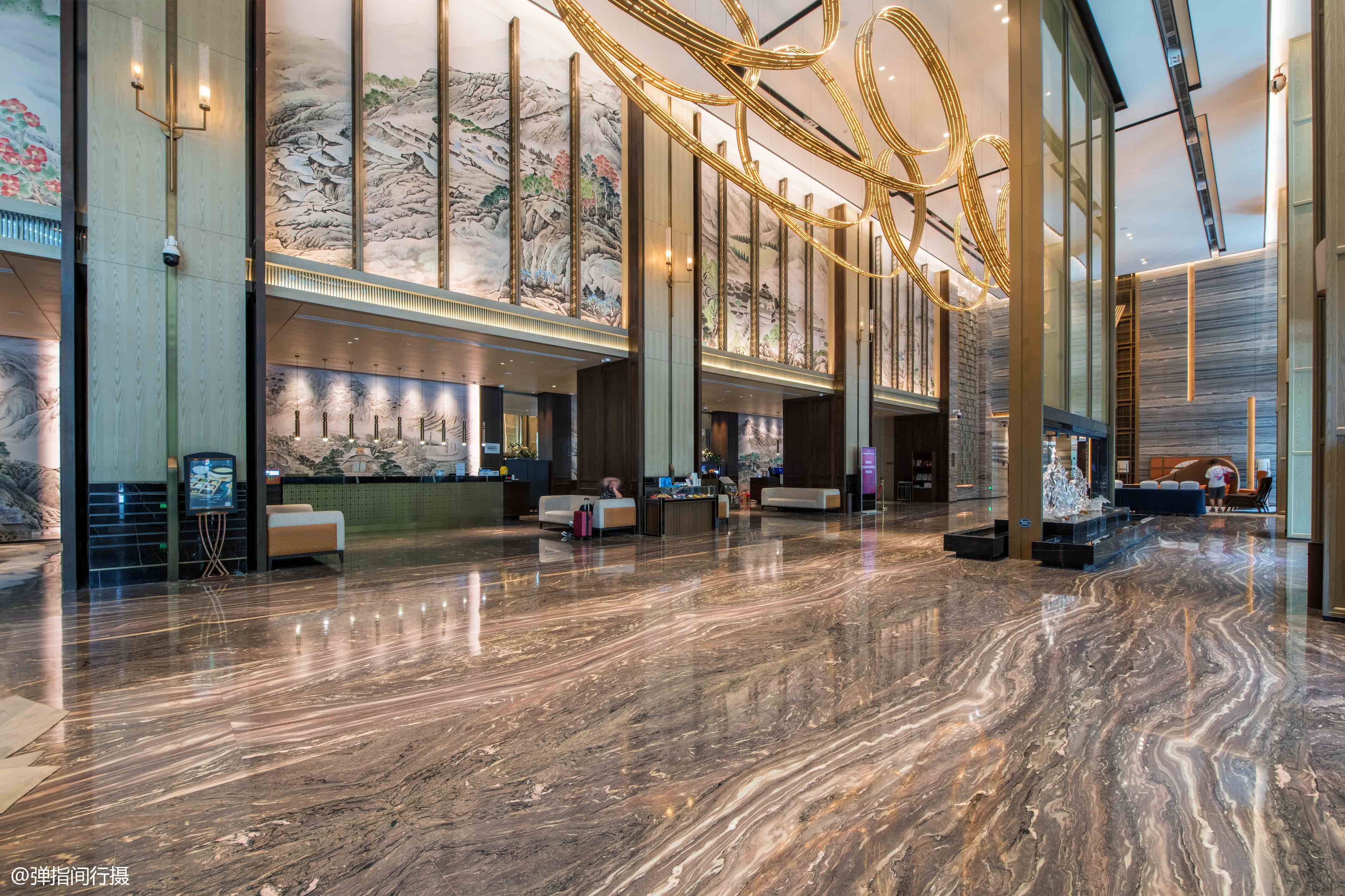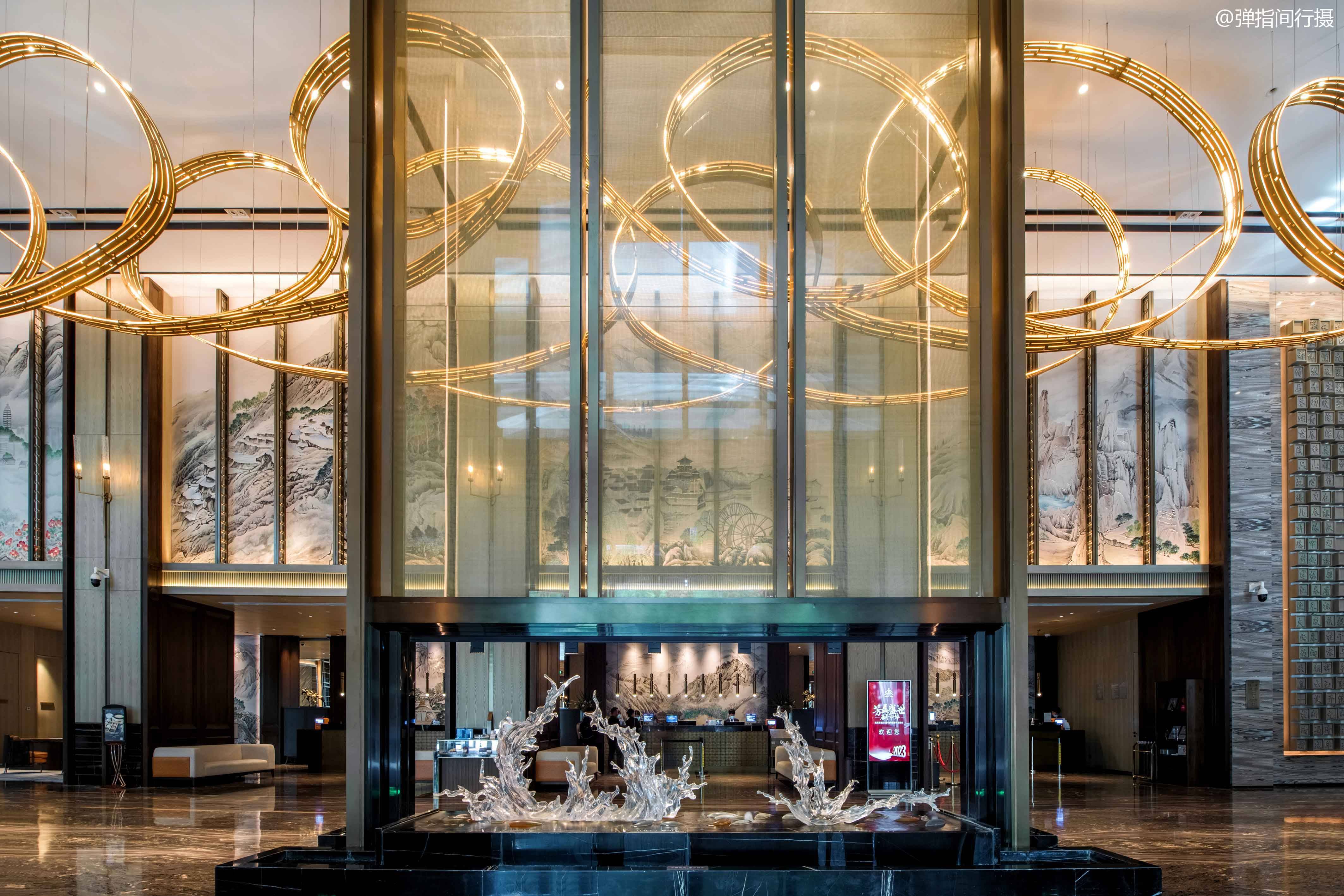 挑高近10米的酒店大堂,顶端悬挂着巨型“彩云之南的云彩”吊灯,造型蜿蜒流长,与入口处的流水设计相互呼应,为空间带来灵动之感。