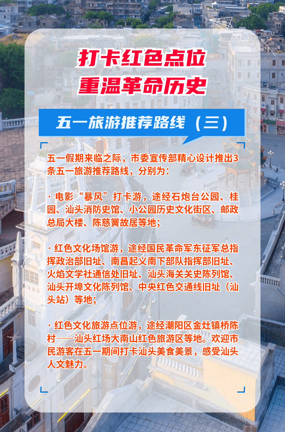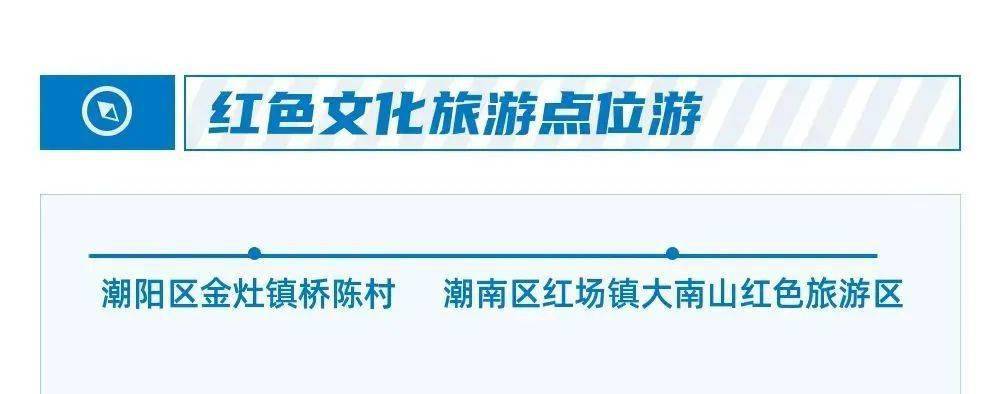 红色文化旅游点位游为潮阳区金灶镇桥陈村,这里有武工队活动旧址、红色主题站厅、秘密联络点等红色点位。此外汕头红场大南山红色旅游区有闽粤赣边区第一次党代会旧址、红场广场、红军医院、红宫、大南山石刻革命标语、大南山革命历史纪念馆等多个红色景点。