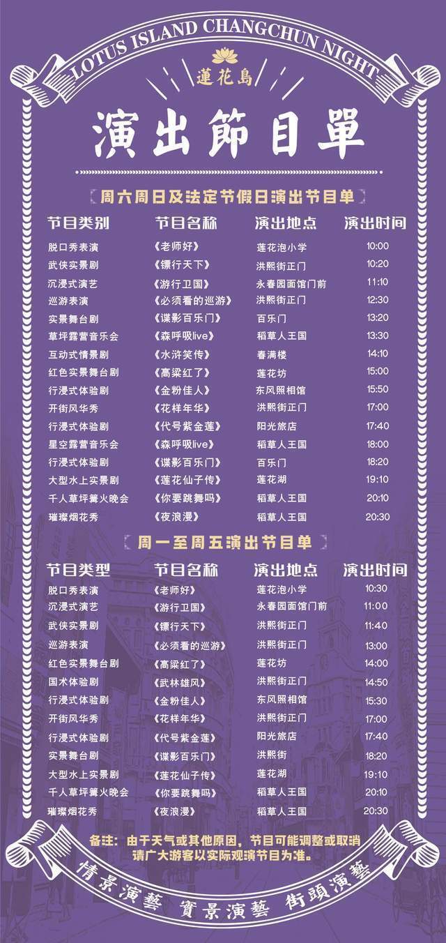 “五一”小长假期间,长春莲花岛影视休闲文化园白天和晚间都准备了丰富多彩的活动。白天将举办“戏精穿越大会”,身着各式服装的演员和游客都可以一起在景区里“飙戏”,每天还有十余场表演。夜晚华灯初上时,集实景演出、水幕秀、激光秀、灯光秀等多种演绎形式融为一体的夜游体验也很别致。另外,还有千人草坪篝火晚会和烟花秀。