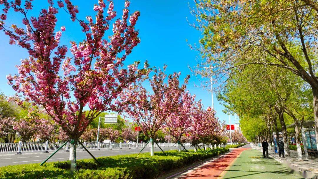 绽放“笑脸”的晚樱,一树树、一枝枝,重重叠叠的花朵粉如腮、艳若霞,就像两条粉色的彩带在道路延绵。微风徐来,枝头摇曳,片片落英,犹如蝴蝶在翩翩起舞。