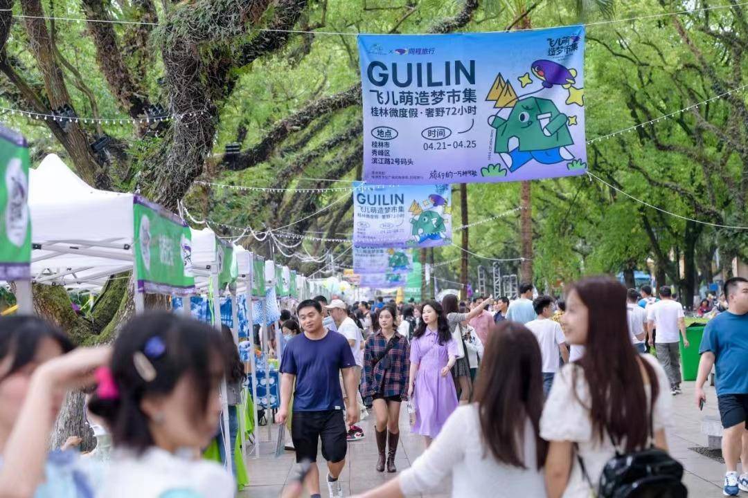 4月21日广西壮族三月三正式开幕,奔赴桂林旅游的游客活跃在各大景区及相关节日活动现场。而在象鼻山景区外,一排超长的创意市集摊位吸引来往游客的注意,超大的“飞儿萌造梦市集”logo前,也有游客等待着空位排队打卡拍照。