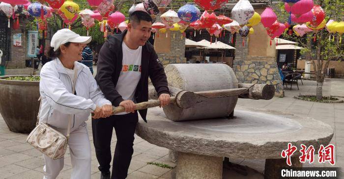 北京游客李路荣(左)和朋友体验推碾子。 徐巧明 摄