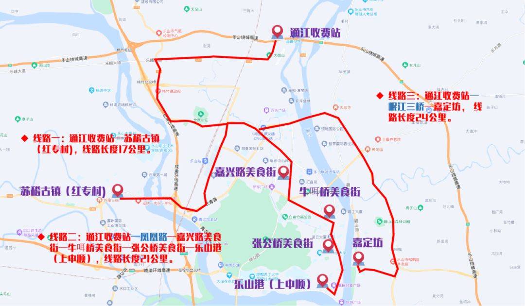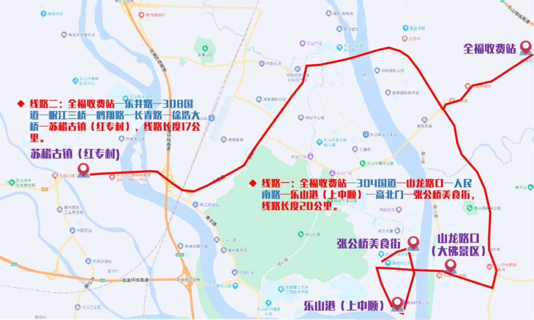 1、全福收费站-山龙路口(乐山大佛景区)-张公桥美食街-乐山港(上中顺)(线路行驶里程:20公里);
