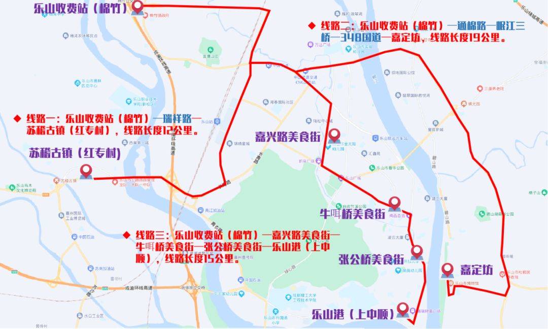 3、乐山收费站(棉竹)-嘉兴路美食街-牛咡桥美食街-张公桥美食街-乐山港(上中顺)(线路行驶里程:15公里)。