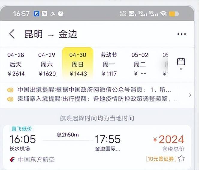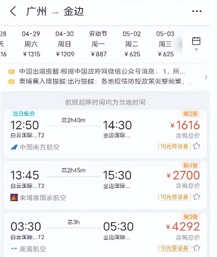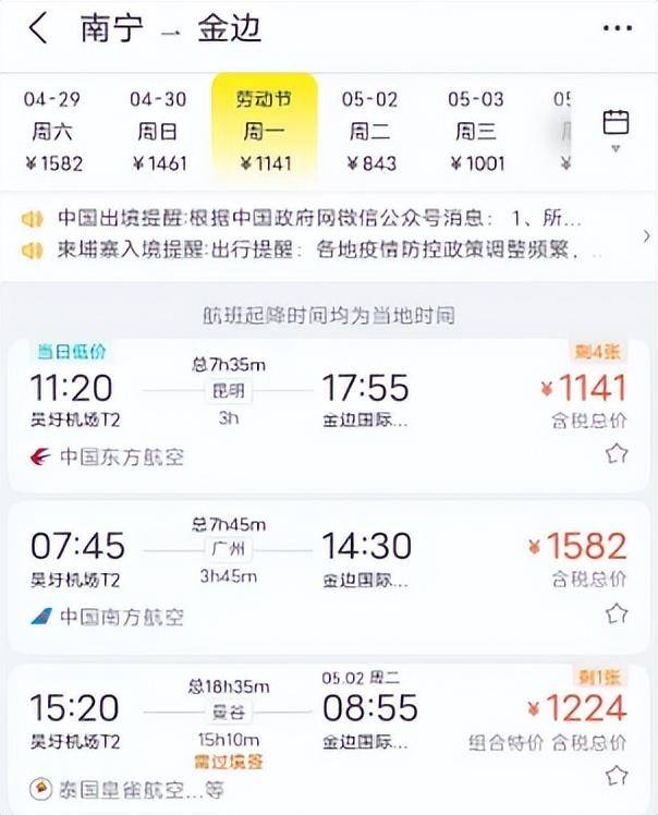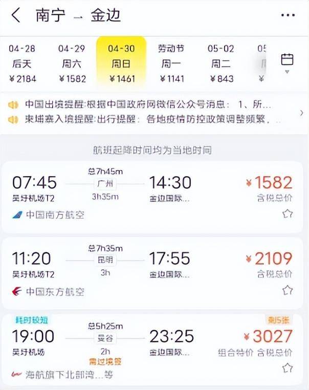 由于临近假期,4月30日、5月1日这两天,南宁到金边、成都双流到金边、昆明到金边,中转航班居多,直飞航班极少。