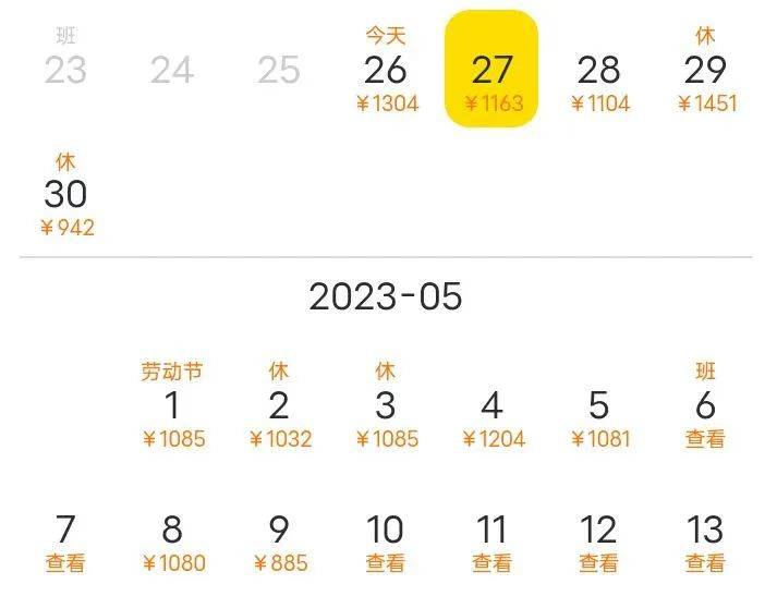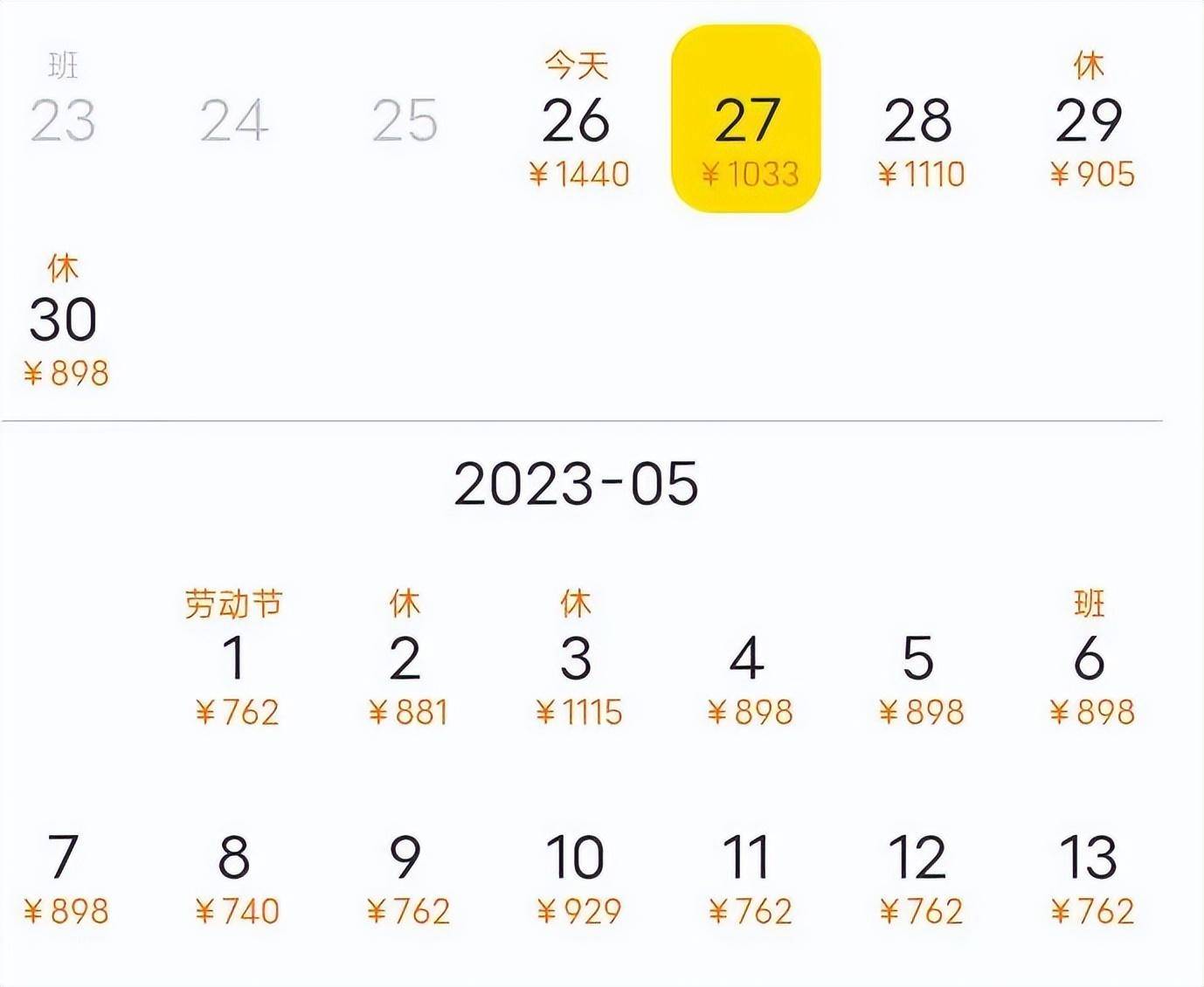 4月26日,小编再次打开该平台,4月底机票价格已从原先的600多元涨至1300元。“五一”期间,最低机票价格也出现小幅涨价,涨幅100-200元。而且可选航班也少了许多。