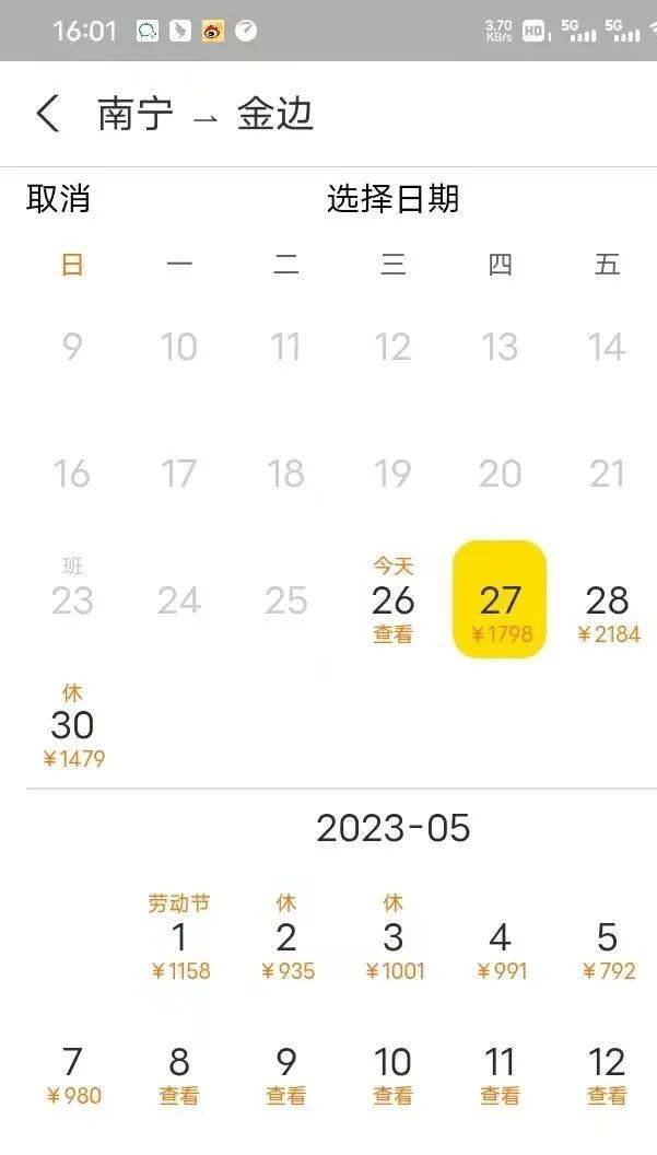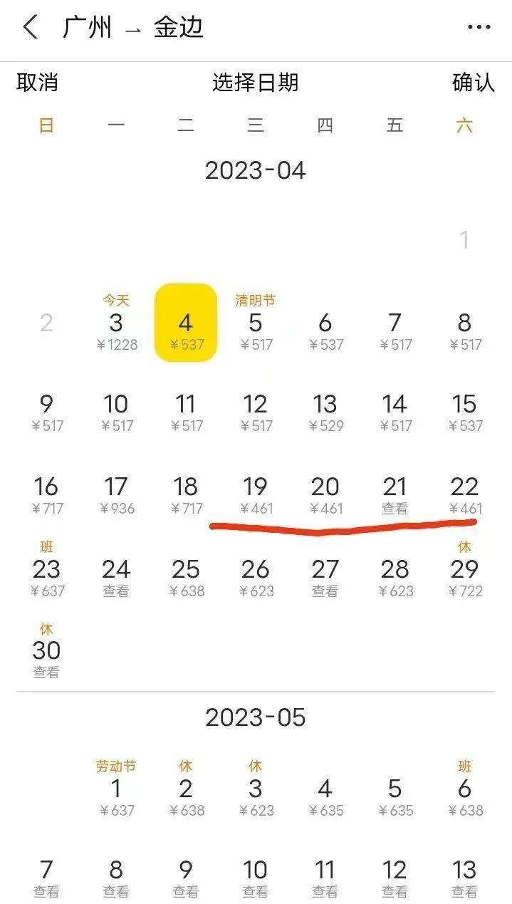 南宁至金边航线,机票价格上涨更多,“五一”前夕机票价格1400元+,个别航班甚至高达2000元,假期后价格才稍有回落。