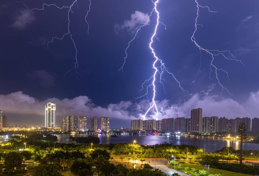 台风“暹芭”带来了大风降雨、强对流、雷暴等天气,闪电在天空划过的瞬间,整个城市被点亮,让人惊叹于自然的壮观之态。图/视觉中国