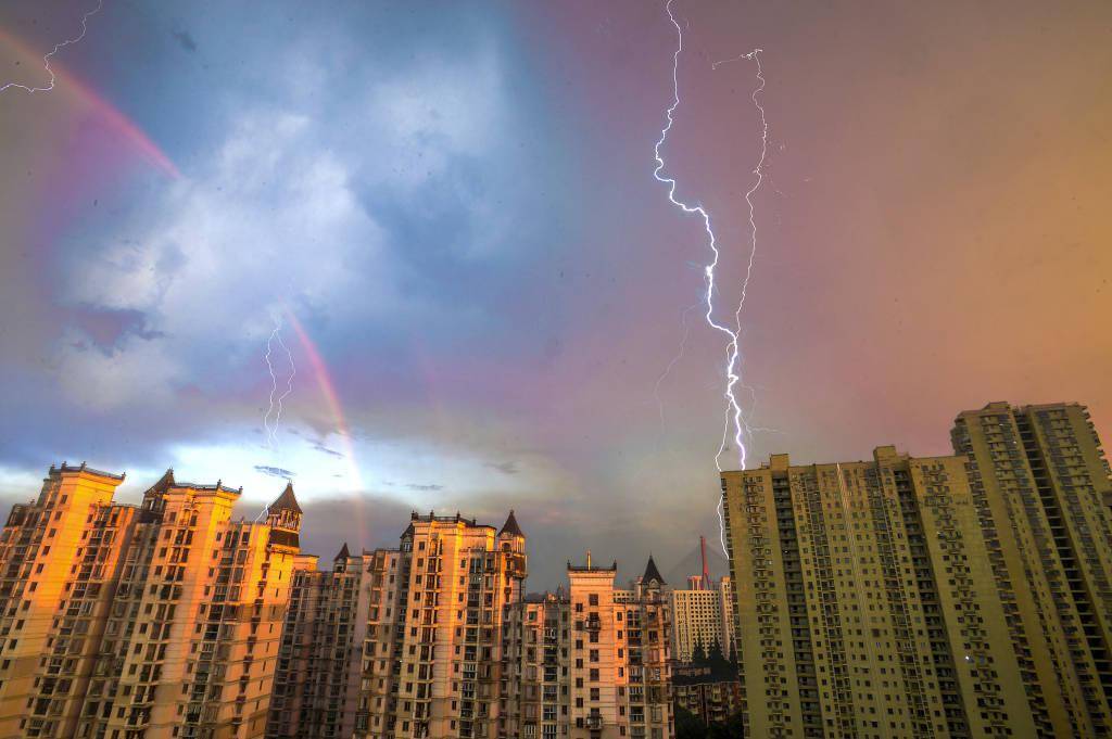 天空中乌云翻滚而来,在雷鸣电闪的隆隆声中,大雨倾盆而下,天空现双彩虹,和闪电同框相遇。陈明松/视觉中国
