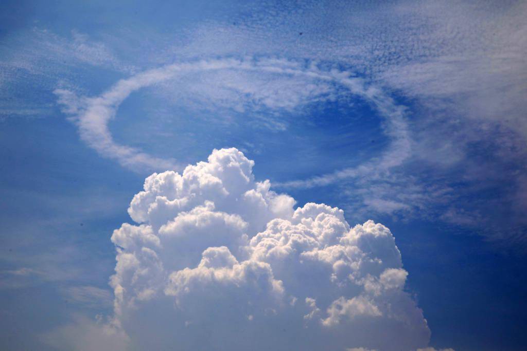 城区上方出现罕见环状云朵,只见环状云朵处在低空中,呈现出一个非常清晰的圆环形状。詹俊/视觉中国(编辑:黄炜倩)