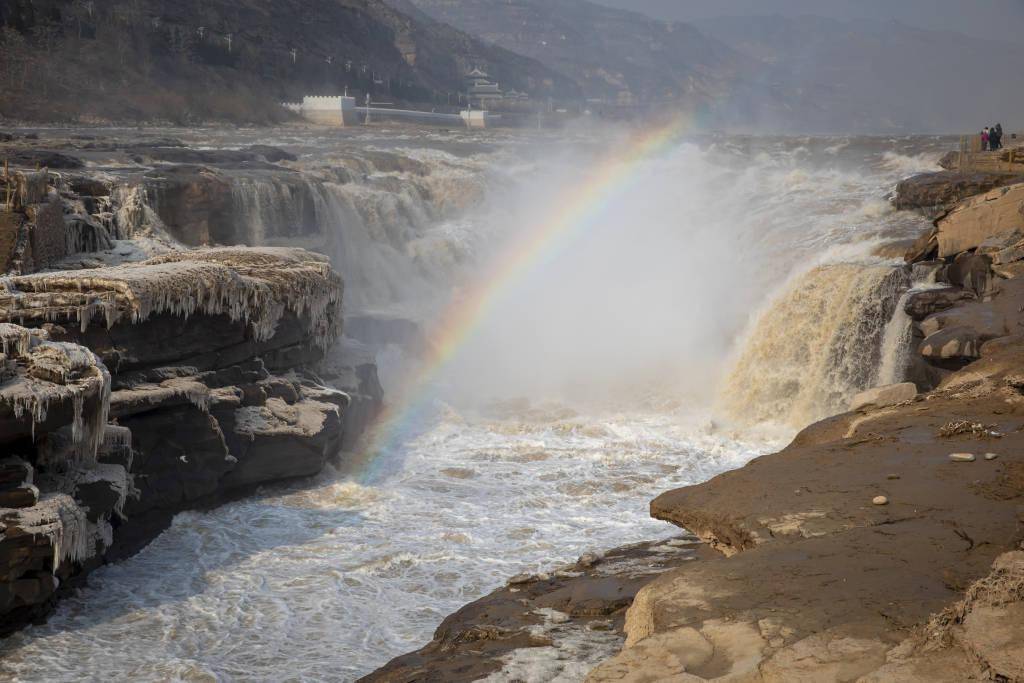 冬日的黄河壶口瀑布川流不止,河面上空一道彩虹出现,如同一道桥一般横跨,连接彼岸。曾文平/视觉中国