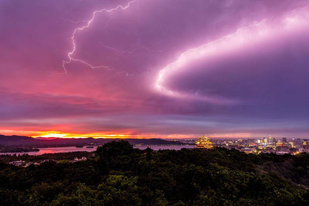 强对流天气过后,绚丽的晚霞和闪电同时出现在天空中,场面惊艳而震撼。潘永舟/视觉中国