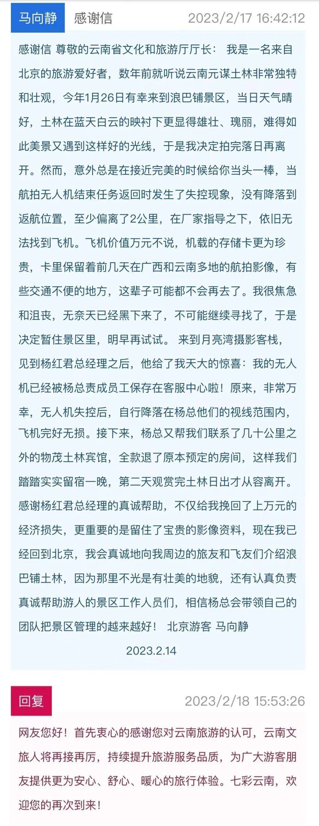 “感谢杨红君总经理的真诚帮助,不仅为我挽回了上万元的经济损失,更重要的是留住了宝贵的影像资料,现在我已经回到北京,我会真诚地向我周边的旅友和飞友们介绍浪巴铺土林,因为那里不光有壮美的地貌,还有认真负责、真诚帮助游人的景区工作人员们。”信中,马向静满是感激之情。