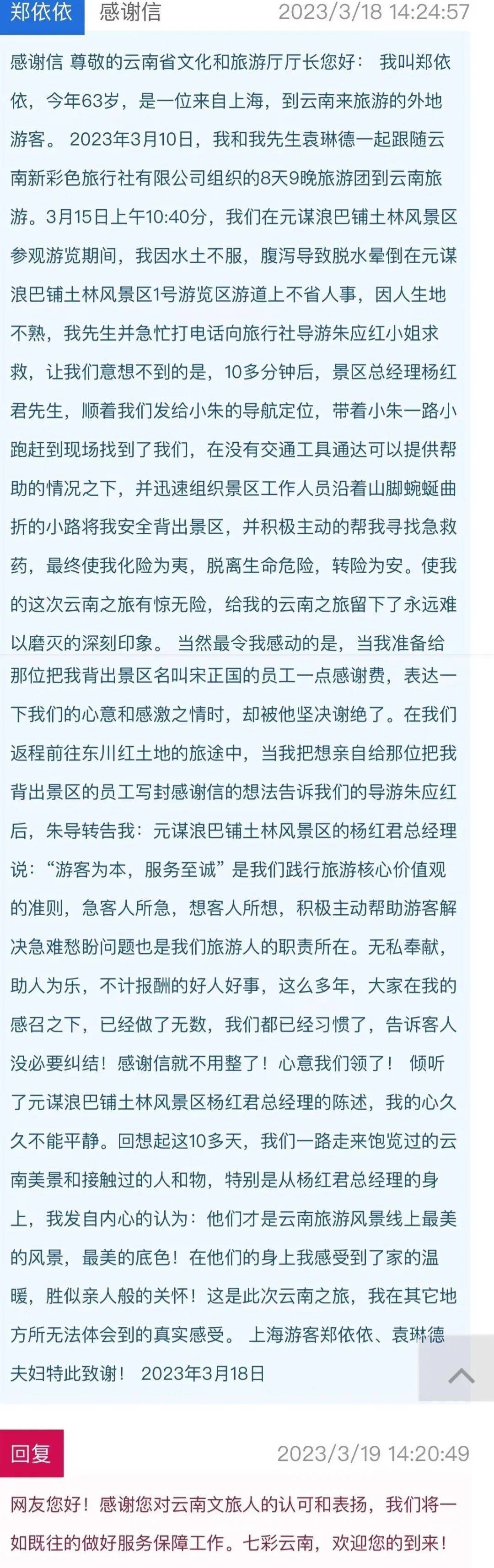 最令这对夫妇感动的是,当他们拿出一点感谢费给背人奔走的好人时,却被坚决谢绝了。景区员工宋正国说:“每个云南人遇到这种情况,都会毫不犹豫地出手相救,不收分文!”景区负责人称:“急客人所急,想客人所想,积极主动帮助游客解决急难愁盼问题是我们旅游人的职责所在。”