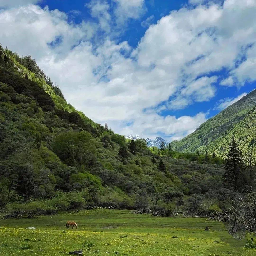 春季的四姑娘山,美得不可思议。每条沟都变得绿意葱茏,野花遍地盛放,山麓地带森林茂密。
