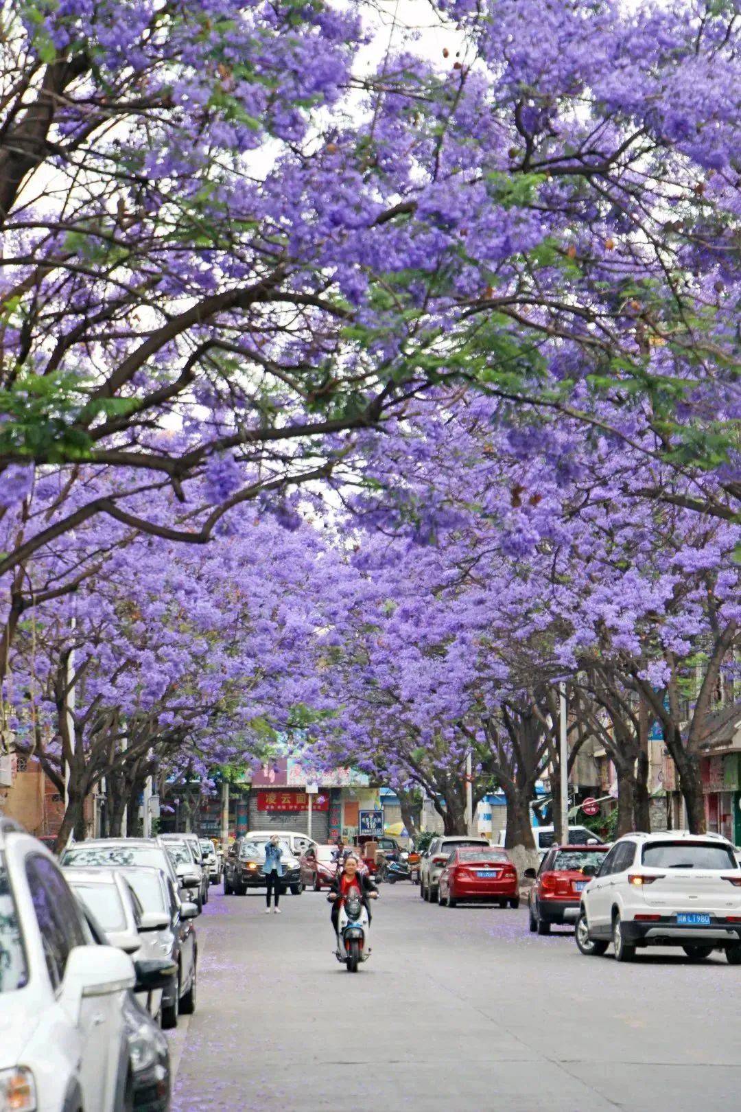 一条条街道被浪漫的紫色花海“攻陷”,盛放的蓝花楹变成了西昌春天里最亮丽的风景线。
