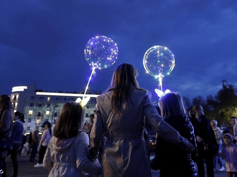 马尼亚布加勒斯特,在“聚光灯”国际灯光节期间,该国一名妇女带着她的两个女儿穿过街灯装置。